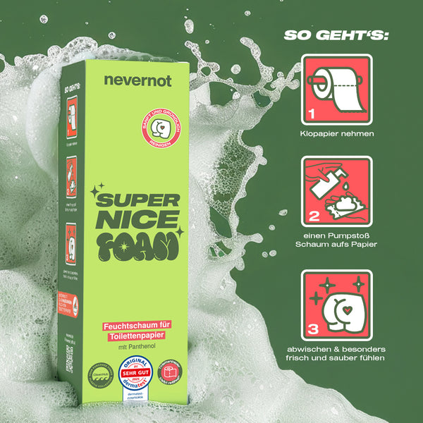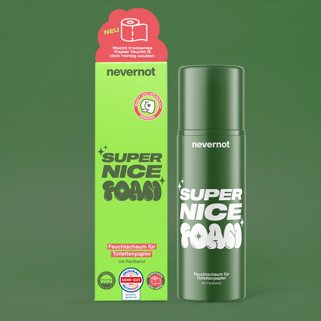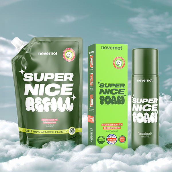 Feuchttücher sind ein Problem: Sie gehören nicht ins Klo, stecken voller fragwürdiger Inhaltsstoffe und sorgen für Ärger in Kanalisation und Hautflora. Super Nice Foam ist die zeitgemäße Alternative – sanft zur Haut, stark zur Umwelt und endlich ohne schlechtes Gewissen.