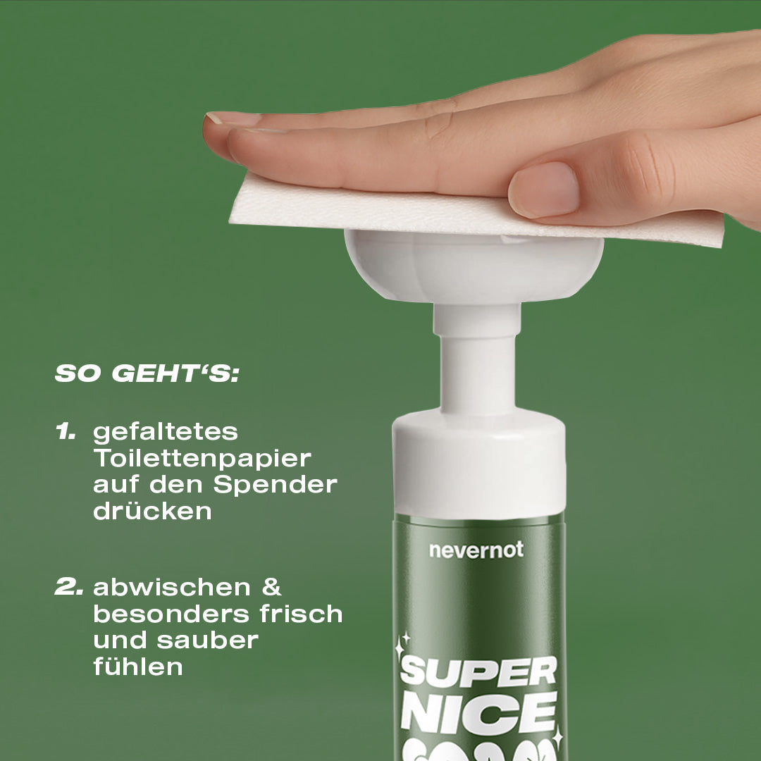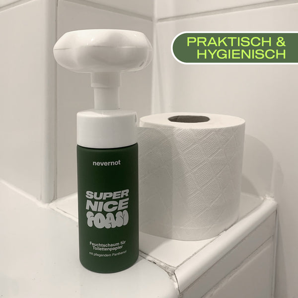 Feuchttücher sind ein Problem: Sie gehören nicht ins Klo, stecken voller fragwürdiger Inhaltsstoffe und sorgen für Ärger in Kanalisation und Hautflora. Super Nice Foam ist die zeitgemäße Alternative – sanft zur Haut, stark zur Umwelt und endlich ohne schlechtes Gewissen.