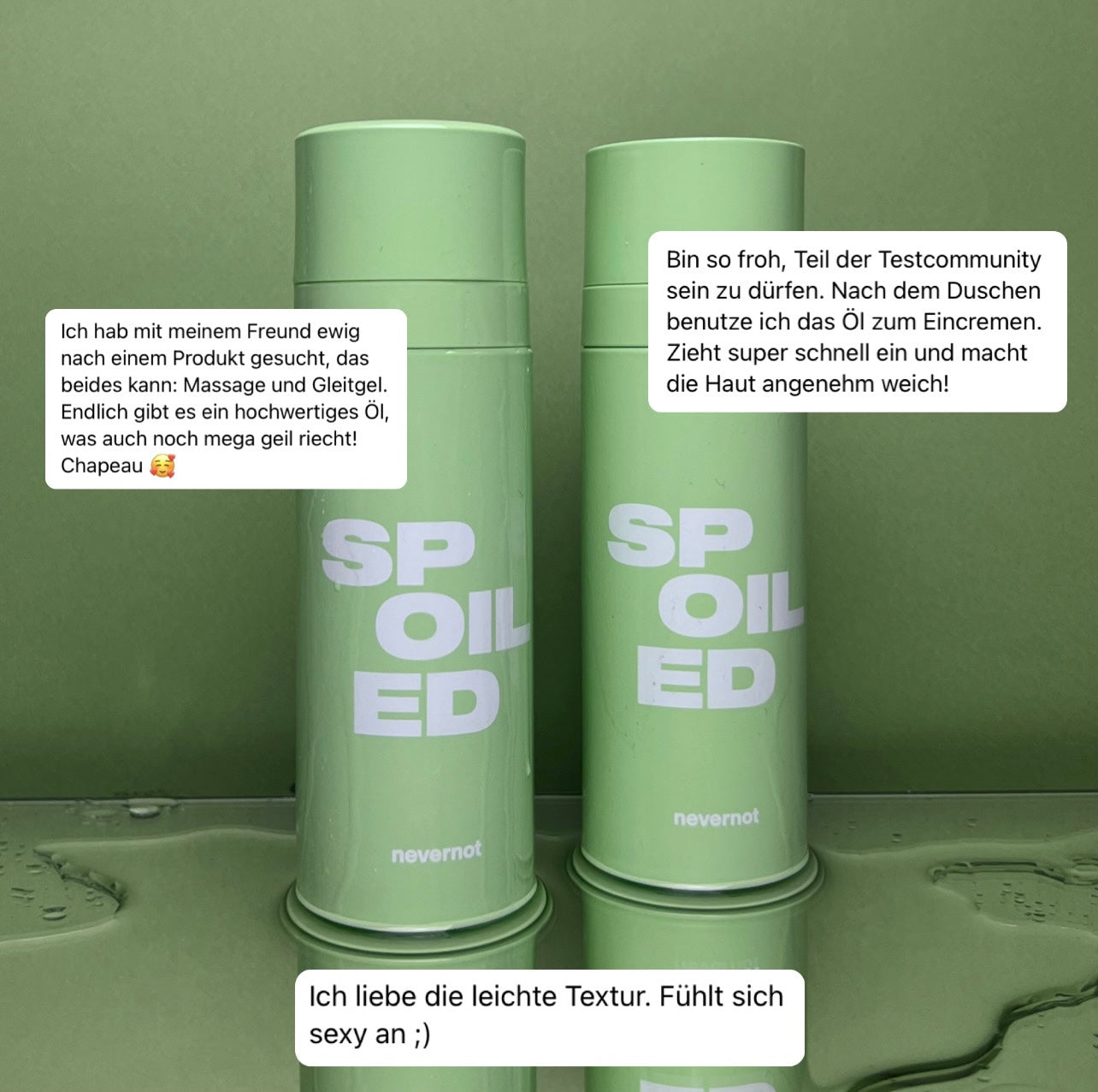 “Wir konnten kein hochwertiges Produkt auf dem Markt entdecken, das für eine Massage und für Se+ eingesetzt werden kann. Deshalb haben wir es kurzerhand selbst entwickelt! Herausgekommen ist SPOILED. Das perfekte Öl für alle Gelegenheiten. Ganz nach dem Motto: Alles kann, nichts muss.”
