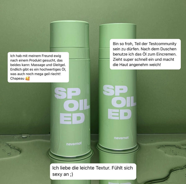 Während Gleitgele für eine Massage oft zu klebrig sind, können Massage- und Pflegeöle meist nicht im Intimbereich oder gar zum Sex genutzt werden, da es leicht zu Schleimhautreizungen kommt. Darum haben wir SPOILED einfach selbst entwickelt.