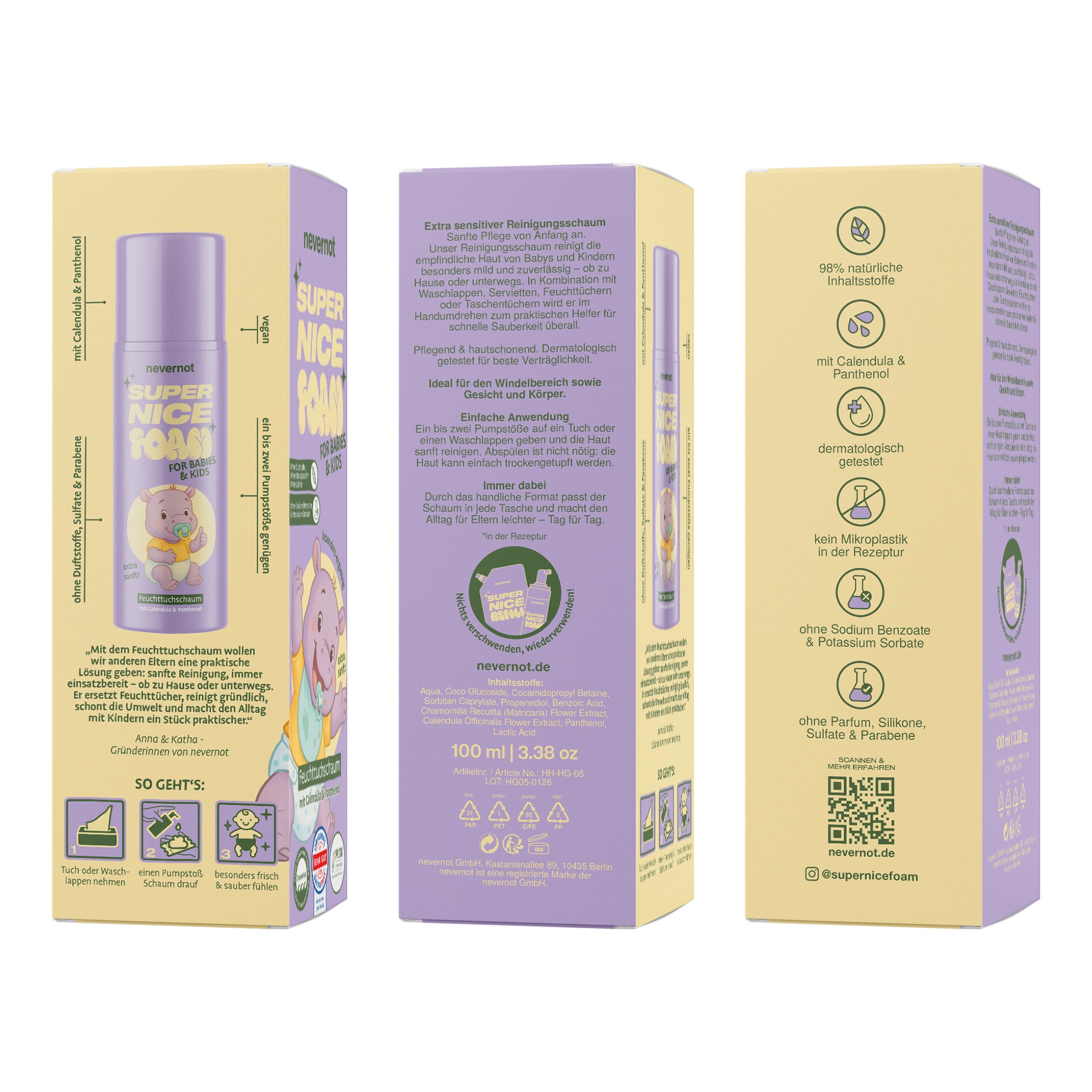 Während viele Produkte auf Konservierungsstoffe wie Sodium Benzoate oder Potassium Sorbate setzen, lässt nevernot genau diese bewusst weg. Stattdessen trifft eine besonders milde Formel auf Inhaltsstoffe wie Calendula und Panthenol, die sanft reinigen und die Haut gleichzeitig pflegen.