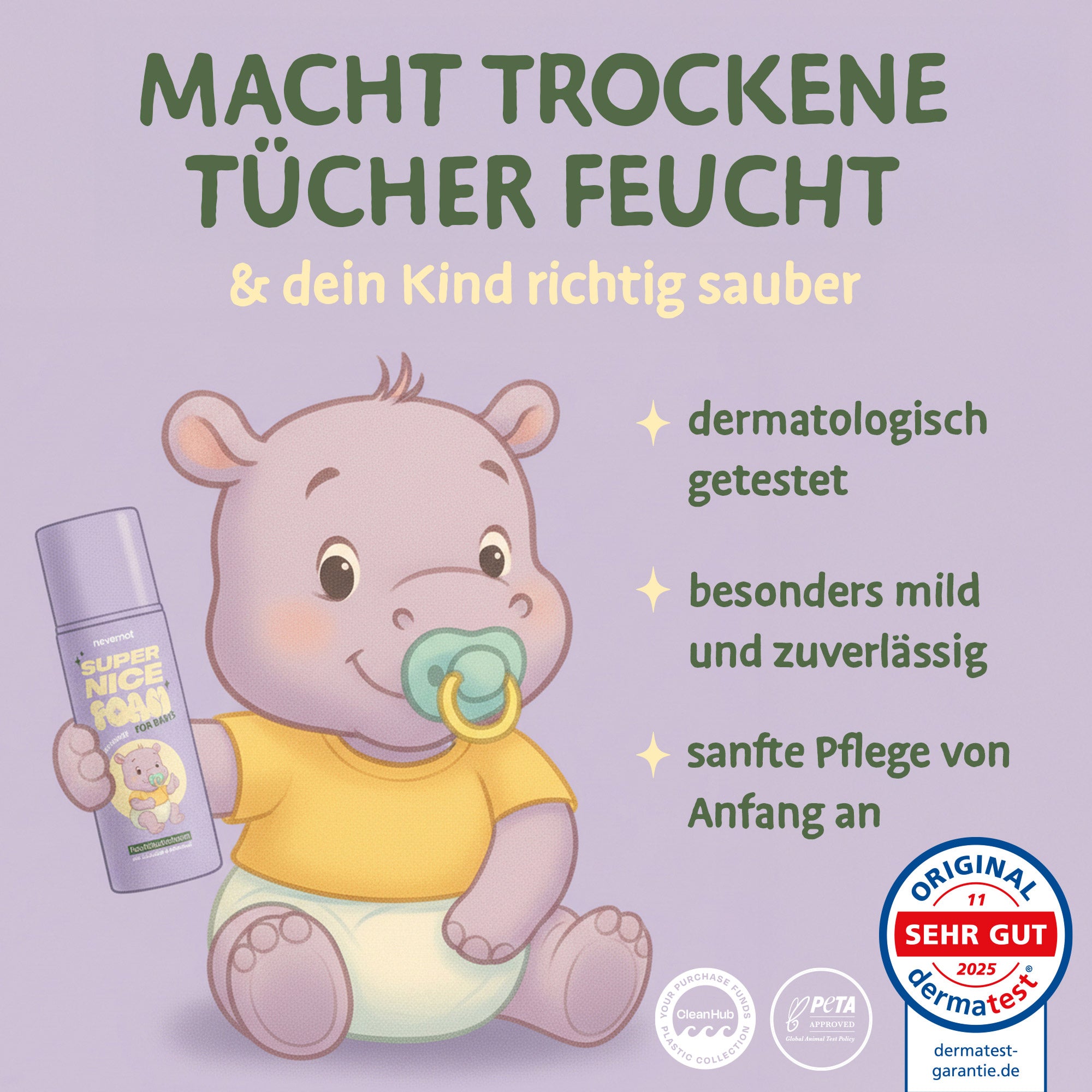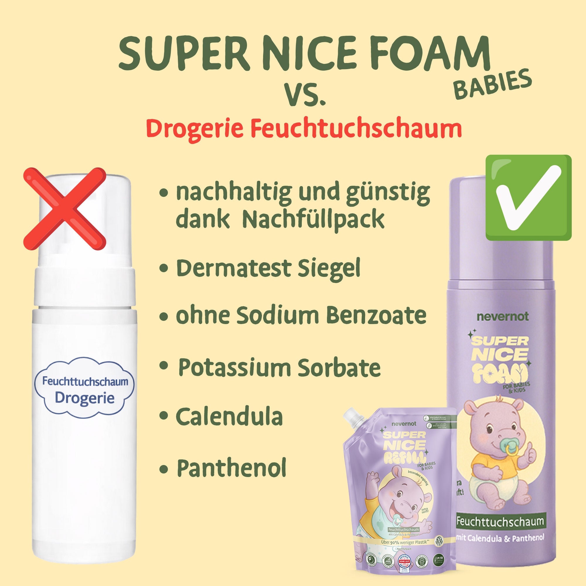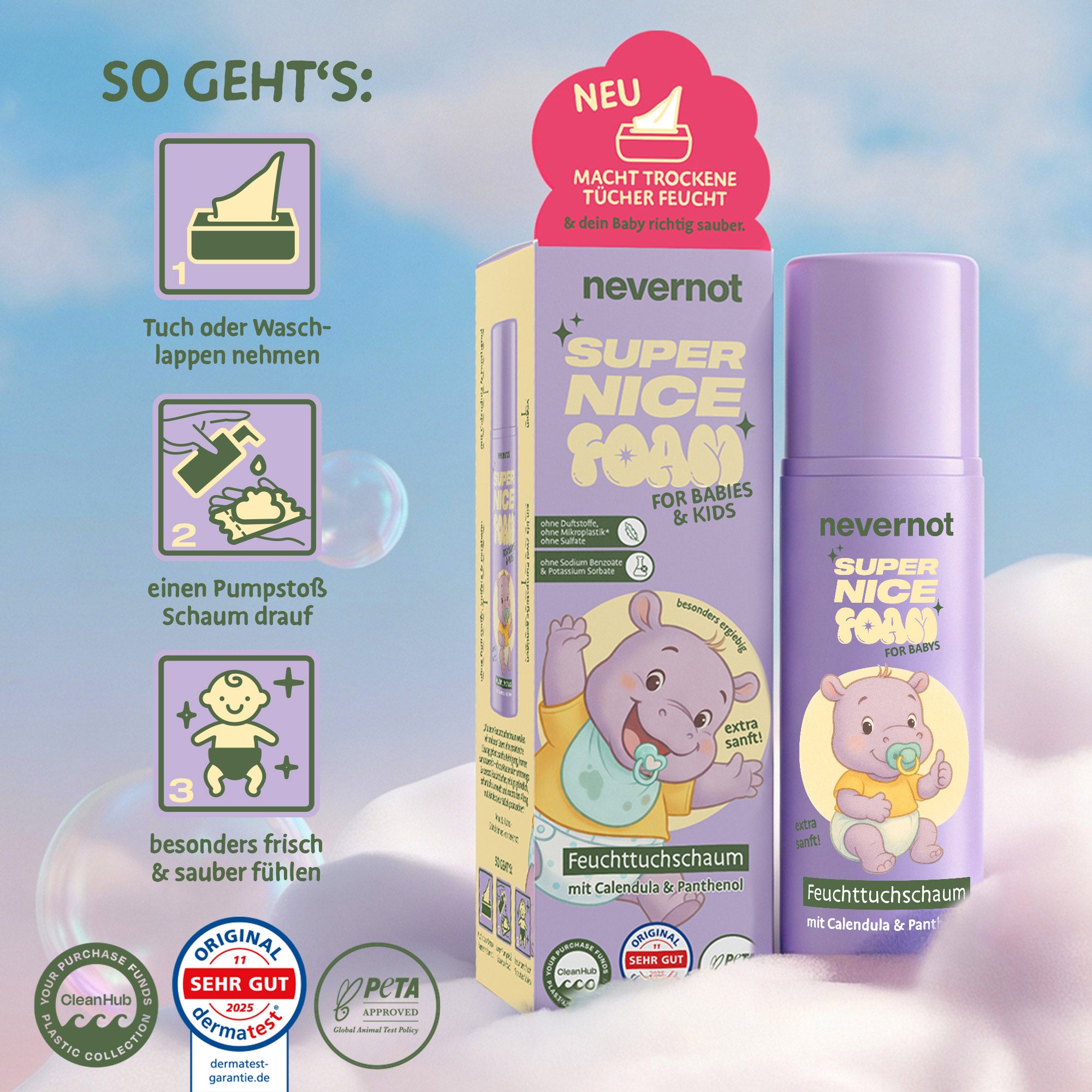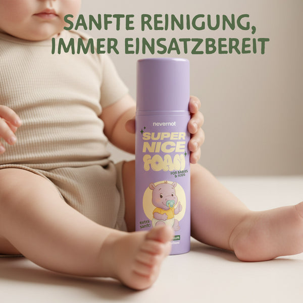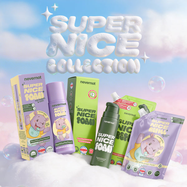 Feuchttücher sind ein Problem: Sie gehören nicht ins Klo, stecken voller fragwürdiger Inhaltsstoffe und sorgen für Ärger in Kanalisation und Hautflora. Super Nice Foam ist die zeitgemäße Alternative – sanft zur Haut, stark zur Umwelt und endlich ohne schlechtes Gewissen.