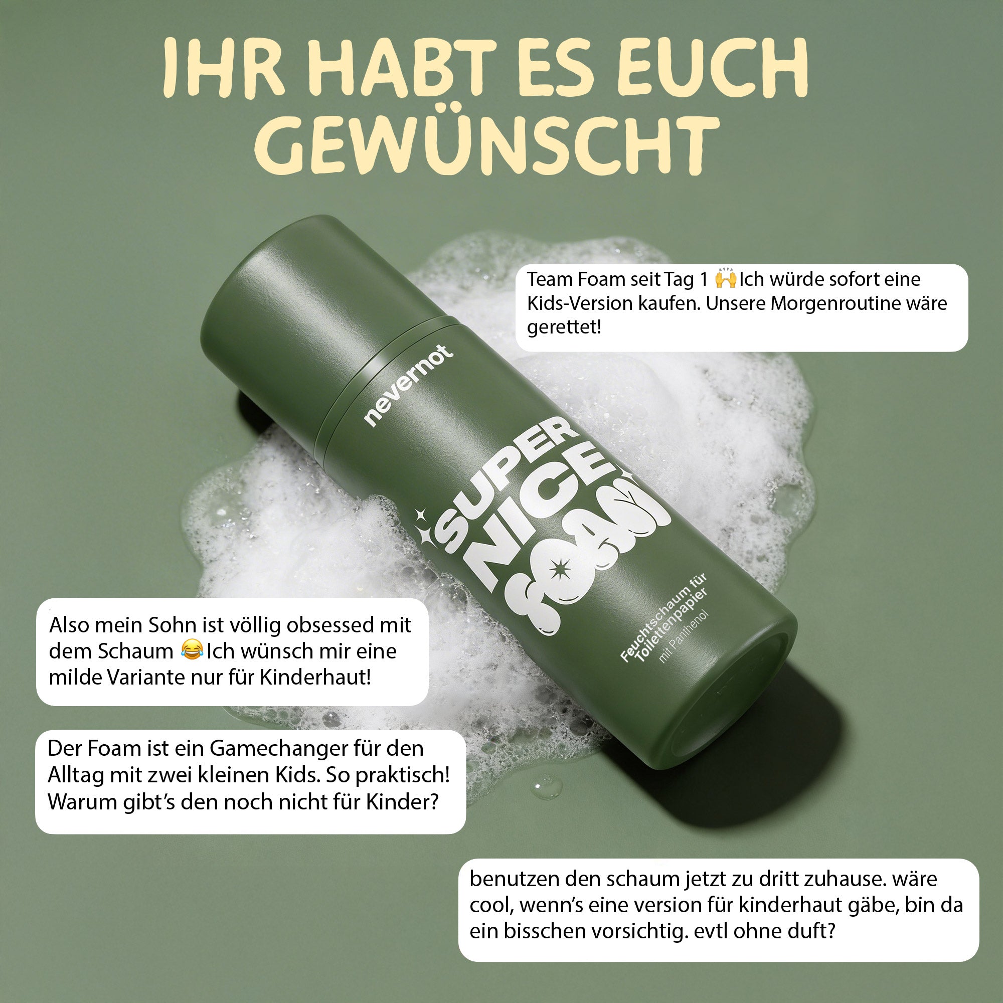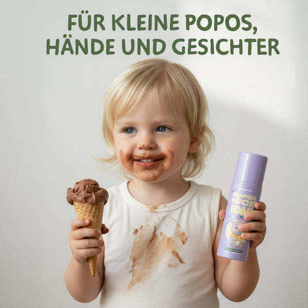 Wir waschen unsere Hände mit Seife, nachdem wir auf der Toilette waren – aber unseren Po? Den wischen wir trocken und nennen das sauber. Klingt absurd? Finden wir auch. Deshalb gibt’s jetzt den SUPER NICE FOAM.